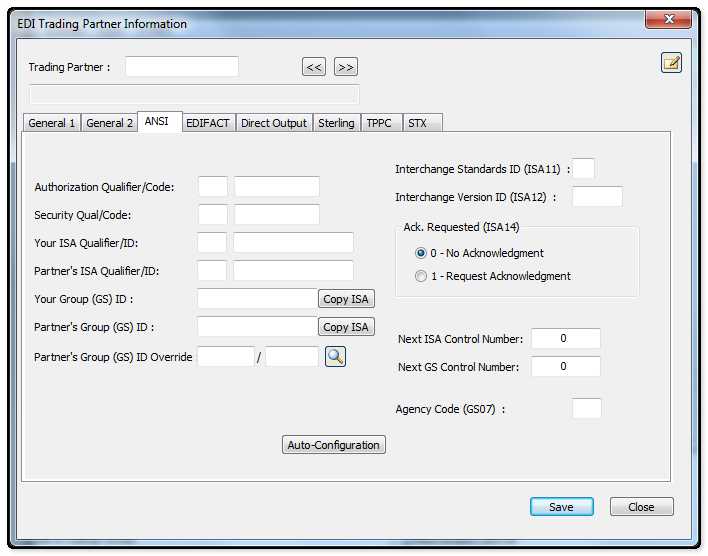 The ANSI screen is used to setup the Trading Partner relationship if you are using ANSI-X12 (ISA/GS Information.