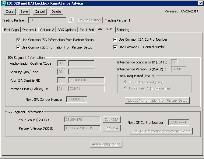 The ANSI X-12 details from the Trading Partner Setup are reflected in this screen. The default setting is to have all 4 check boxes set so as to output this information. Should different information be required uncheck the appropriate box and the information on the screen becomes available to be modified.
