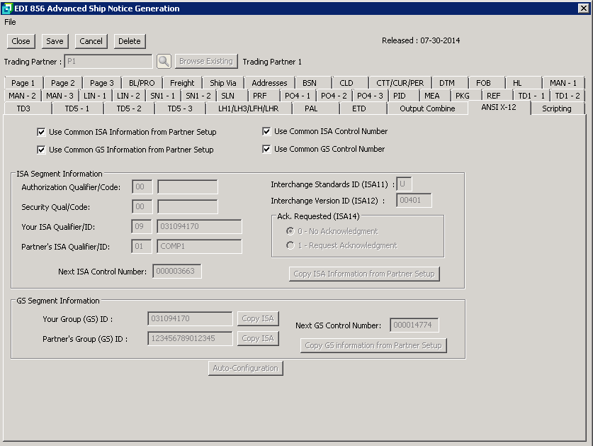 To retain the ANSI X-12 defaults from the Trading Partner setup, all four checkboxes for the common information must remain selected.