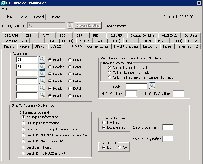 Addresses Up to 6 addresses may be sent in the 810 Transmission. Addresses are set in the Outgoing Addresses Cross Reference. Enter or browse Outgoing Address Configuration and select the required address codes and whether they are required in the Header or the Detail section of the transmission. |