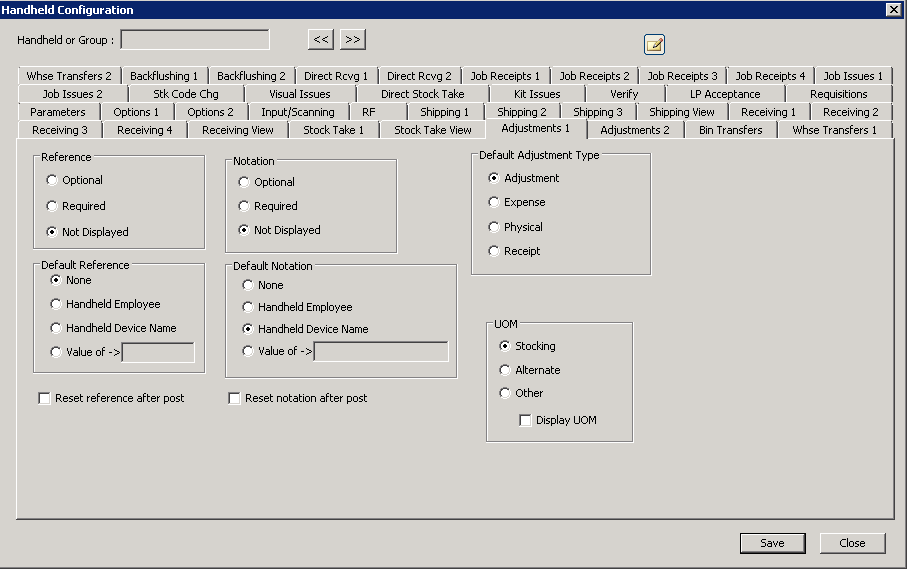 Default Adjustment Type Some modules allow for multiple types of transactions within that module, such as Adjustment, Expense, Physical, and Receipt. So if the user has the SYSPRO permissions to do such transactions, then those types are displayed in the form of radio button selections on the screen. and the following selection determines the default choice displayed at that time. If SYSPRO permissions are not set to allow the operator to perform these transactions, these options will not change that setting. So if a handheld operator does not see a transaction type displayed as noted here, SYSPRO permissions should be reviewed for that operator. Other SYSPRO restrictions may override these settings below. |