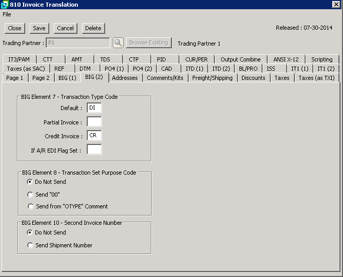 BIG Element 7 - Transaction Type Code Enter the applicable codes for the Default, Partial Invoice or Credit Invoice type transactions or the code to indicate that the AR EDI Flag is set on the customer record. |
