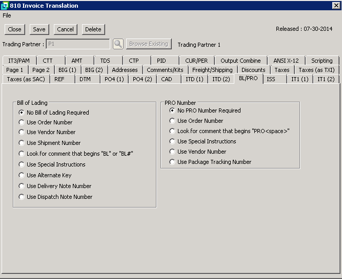 The BL/PRO form is used to establish the location of the freight carrier's Bill of Lading or PRO number if it is required by the Trading Partner.