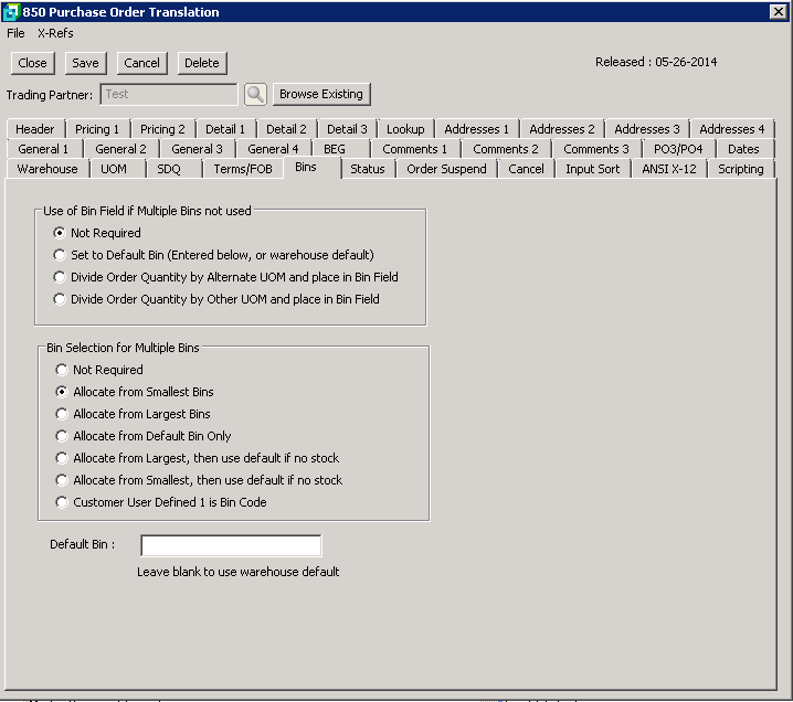 The Bins screen is used to define the default bin selection and stock allocation requirements if multiple bins are being utilized. If multiple bins are not being used, the bin field can be used to store adjusted quantities.