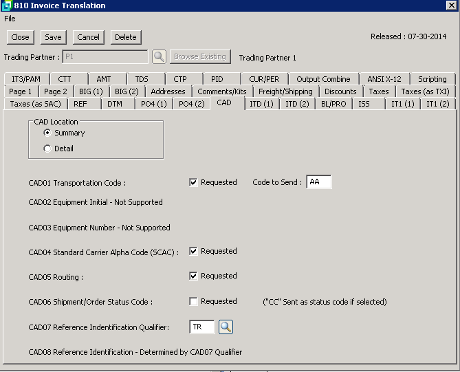 CAD Location The carrier information can optionally be placed in either the summary or detail section of the 810 transmission. Select the required option. |