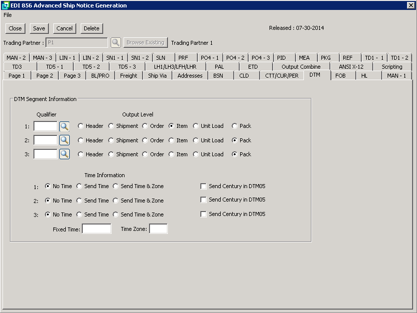 DTM Segment Information There are three DTM segments that can be sent on the 856 document. For the Qualifier you will enter or browse Date/Time Qualifiers and select (or add) the Reference qualifier to use for the Date/Time information. Date/Time Qualifiers can either be setup here by selecting the Browse/Edit/Add or by entering the qualifiers in the Cross-Reference Maintenance/Date/Time Qualifiers. The screens are identical. The Output Level for each qualifier selected, select the location where the qualifier is to be placed within the 856 document: The Header, Shipment, Order, item or unit load. |