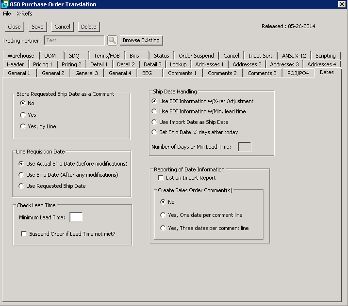 The Dates screen is used to define the various date requirements (e.g. Ship dates, requested dates) that are sent in the 850 document as well as how the system is to handle the date requirements.