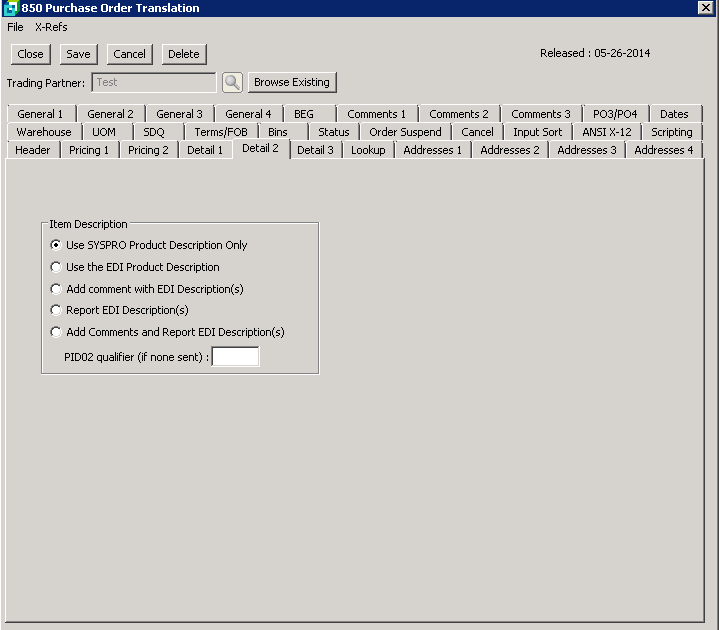 Item Description Product description may differ between EDI and SYSPRO. The system is able to use either description. In addition, the order can use the normal SYSPRO description and reflect the EDI description by way of comment. The system can also report on EDI descriptions or both report and display comments. Select from the following options the description method required. |