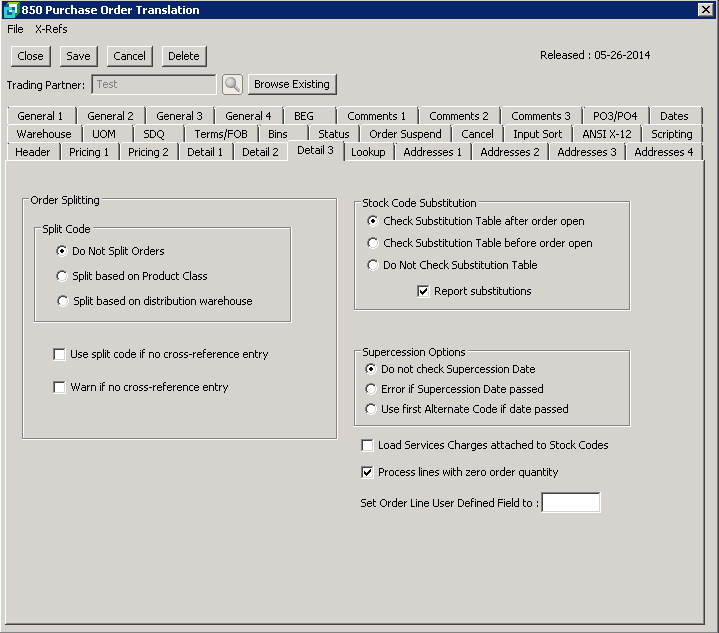 Stock Code Substitution Under certain circumstances the item ordered on the 850 may be substituted by another item. Details of the substitution are held in the Stock Code Substitution table in the Cross References. Select the stock code substitution method to use. |