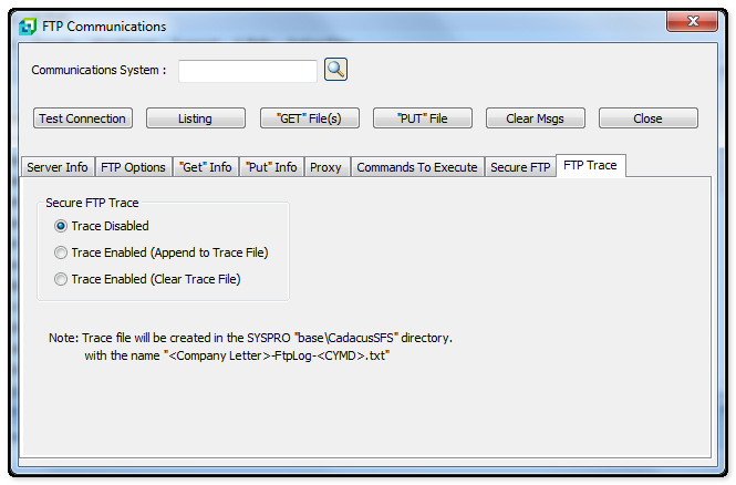 NOTE: Trace file will be created in the SYSPRO "base/CadacusSFS" directory with the name "<Company Letter>-FtpLog-<CYMD>.txt"