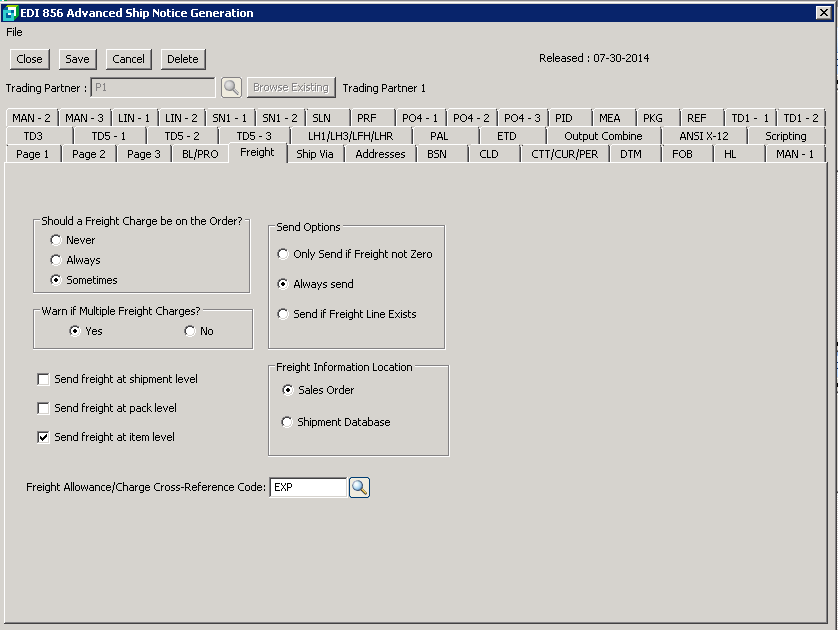 The Freight screen is used to define the source location for freight as well as how freight charges are to be handled by the system when sending the 856 Document.