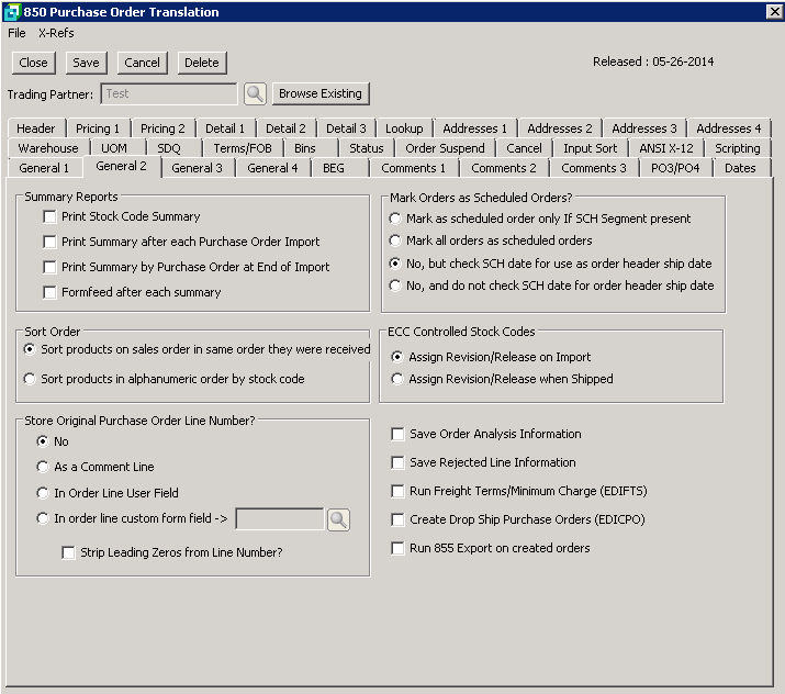 Summary Reports The General 2 screen is used to define the requirements for handling sales order information such as reporting requirements, order sort, line numbers, scheduled orders and ECC requirements. |