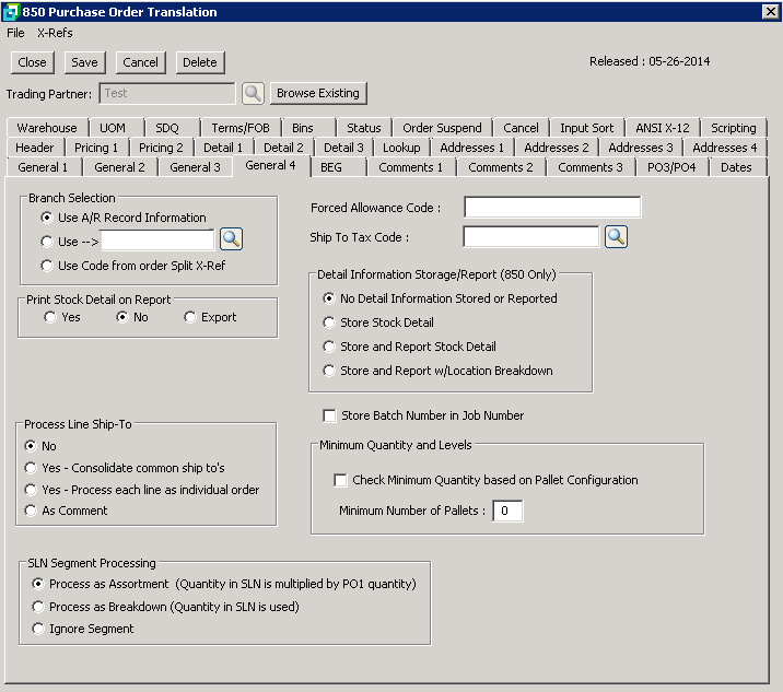 The General 4 screen is used to define processing requirements for options relating to Branch selection, reporting details, SLN segment processing, line consolidation as well as other options relating to handling information in the 850 translation document.
