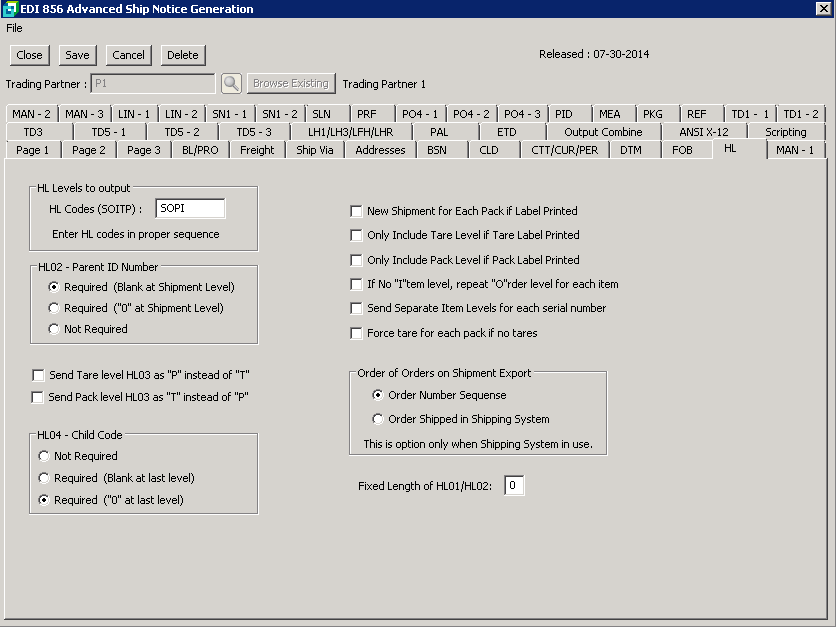 The HL (Hierarchical Level) screen is used to structure the layout of the information required to be sent in the 856 document as well as define preferences for order selection, label printing and how to handle, tare and pack requirements.