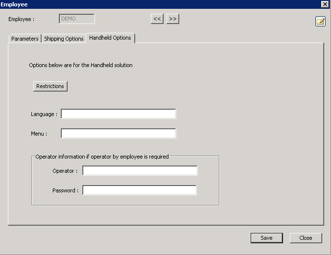 Click on the button to select the modules the employee is permitted to access when using the Handheld in the following areas: