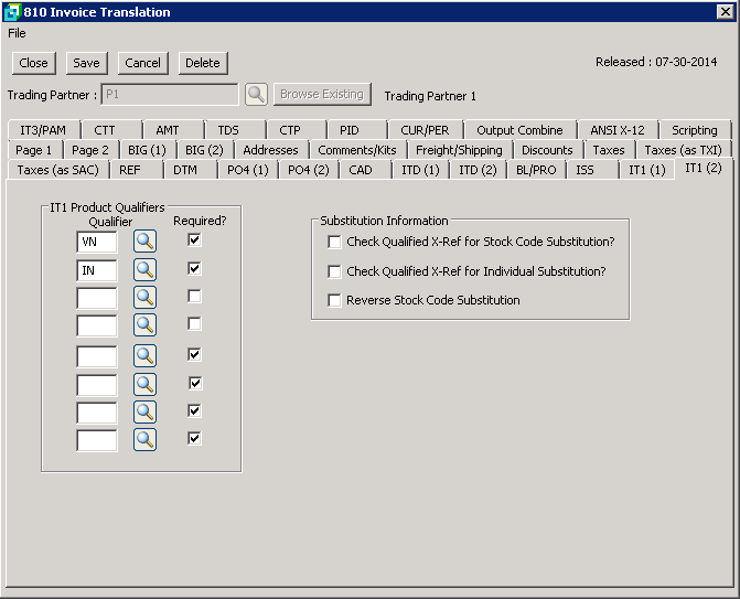 IT1 Product Qualifiers Qualifiers are entered in the Product Qualifier section of the Cross-Reference program. The qualifiers selected here have a fixed place within the IT1 segment of the 810 Transmission and therefore must be entered in the order specified by the Trading Partner. The first Qualifier will start on element IT106. Example: Assume two qualifiers are required for the stock code, one for a SYSPRO stock code (VA) and one for the Buyer's stock code (BC). If the Trading Partner requires the Buyer's stock code first followed by the SYSPRO stock, then enter the BC in the first box and VA in the second box. These qualifiers together with the codes would fill in elements IT106 to IT109. If the Trading Partner requires IT106/07 to be unused and the information moved up, then enter 2 dashes in the first field "--". To space the information to different elements use the dashes in the appropriate field. Qualifier - Enter or browse Product Qualifiers and select the Product qualifiers requested by, and mapped according to, the Trading Partner's documentation. Required - Select if the qualifier is required. |