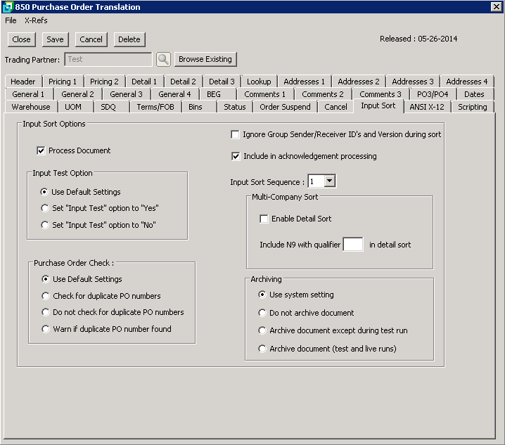 Input Sort, Output File Combine and Acknowledgment Scanner all go together. Input sort is designed to take a combined transmission taken off the VAN or via ftp or AS2 etc. and break it down into the individual documents. Generally this facility will not be used if a package like TPPC is used as the package will break down the transmission. In the file we could have multiple Trading Partners, multiple documents, various document versions, etc.