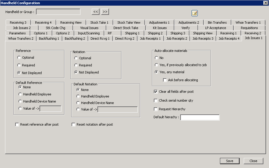 For each transaction type (adjustment, receiving, job issue, etc.), the following options tell the handheld whether it should ask for the reference or notation, and secondarily whether a default value should be used.