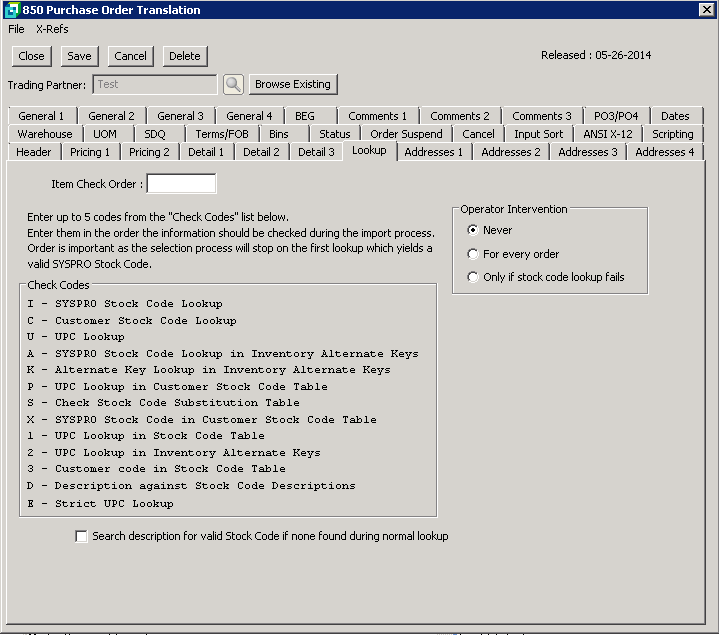 The LookUP screen is used to define the process for locating stock codes within SYSPRO. This is also used to define operator intervention during the processing of the 850 documents.