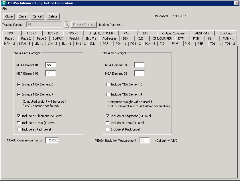 The MEA screen is used to define the elements for the MEA segment which is used to specify physical weight measurements.