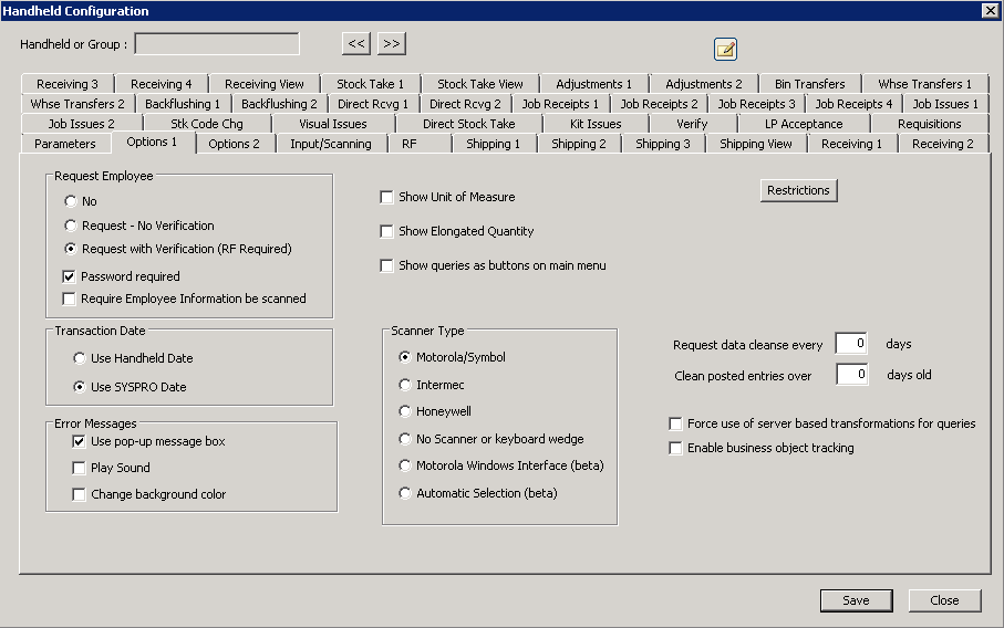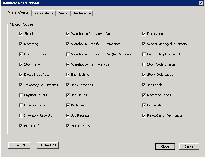 Launches the restrictions screens for enabling/disabling handheld restrictions or module access Note: if checking employees, system uses the same screen and BOTH must be checked. If restrictions are being used, It is recommended to start with handheld restrictions, then use the employee to narrow down restrictions (for example, if an employee is added, then handheld restrictions will limit access accordingly). |
