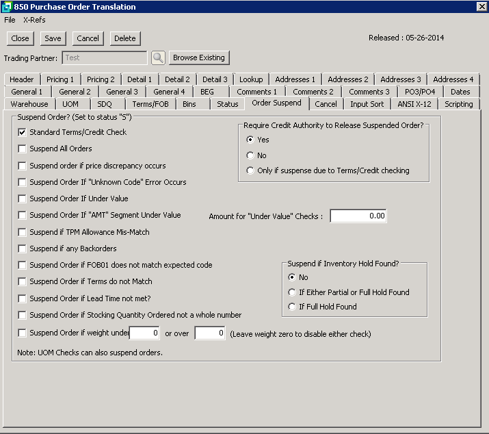 The Order Suspend screen is used to define when or if an incoming order should be placed in suspense, and to define the requirements for releasing an order that has been placed in suspense.
