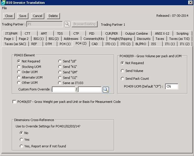 Dimensions Cross-Reference Select to have Dimensions Cross Reference Information as set in the Cross Reference, override settings for PO401/02/03/13. |