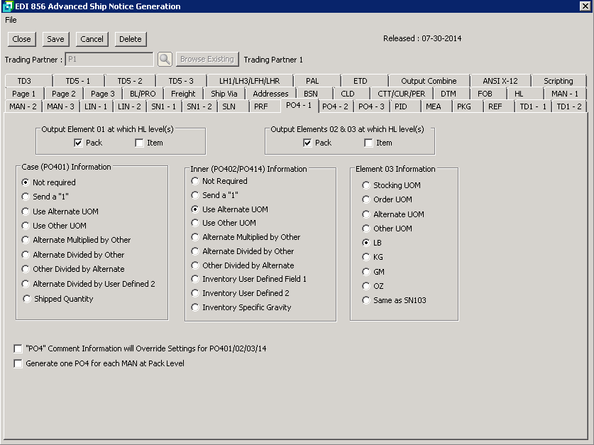 Select to send PO402 and PO403 Elements at Item Level in the 856 document |