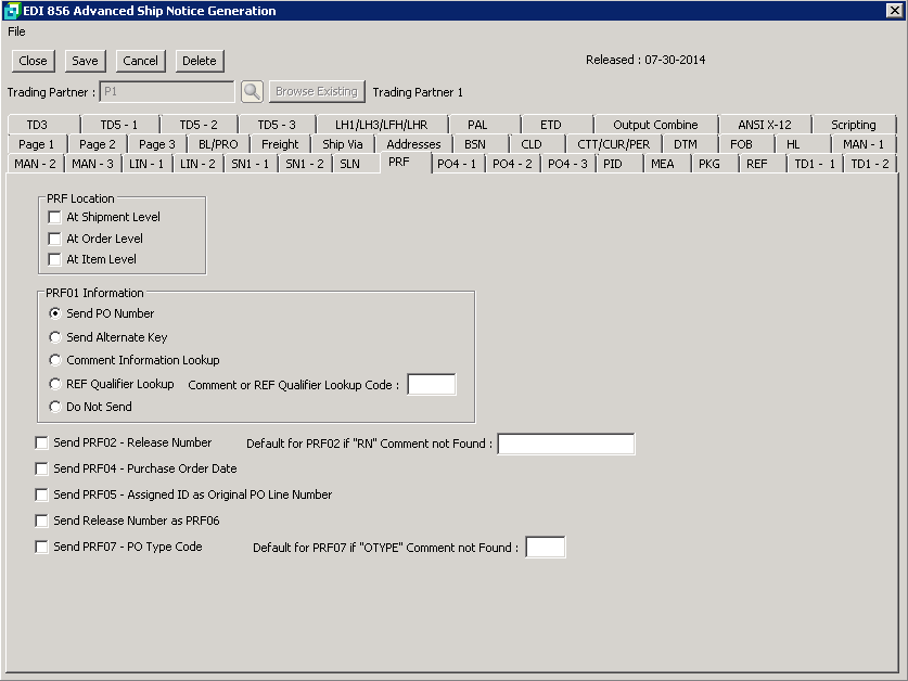 The PRF screen is used to define the Elements for the PRF Segment. The information defined here here is purchase order specific and relates to details such as purchase order number, release number, contract numbers, purchase order dates, etc.