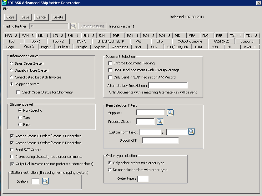The Page 2 screen is used to define the source of the information that is to be included in the ASN and various restriction options for sending the information.