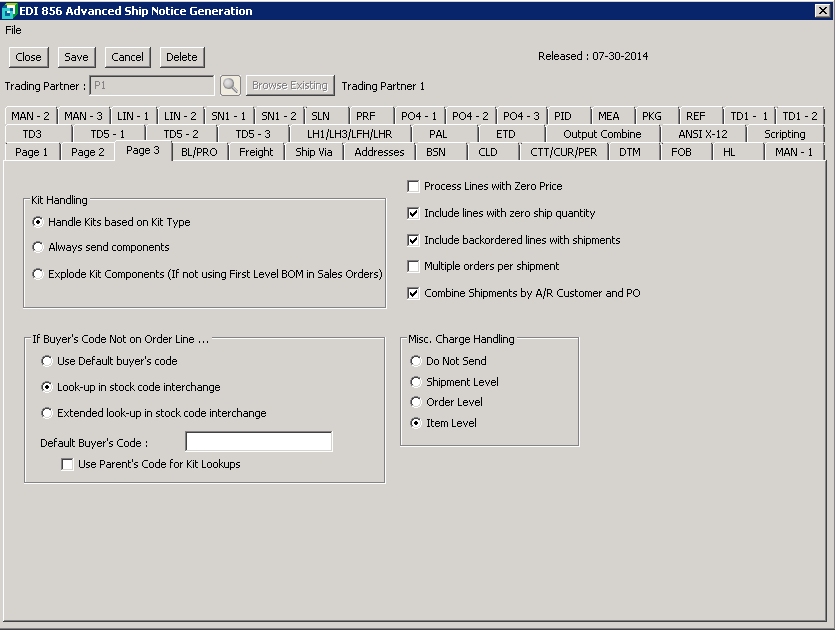 The Page 3 screen is used to define how the system is to handle Kit orders, the buyer's code when it's not included on the order, miscellaneous items as well as options for processing lines having zero pricing and quantity and if multiple orders per shipment are allowed.