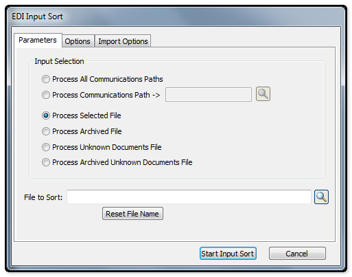 Select this option to process the Unknown Document file. The path and file name as defined in the Input Sort Setup within the EDI System Setup for the Unknown Document file can be viewed int eh "File to Sort" field at the bottom of the screen. |