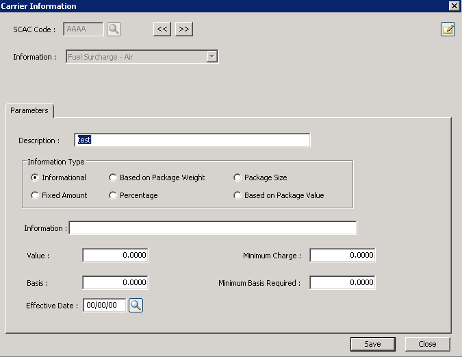 Information Type The Information Type is dependent upon the service type selected above. The information provided here could be for informational purposes only or it can be used to define the basis used for calculating a charge. Select the required Information type that applies to the selected Service Type above. |
