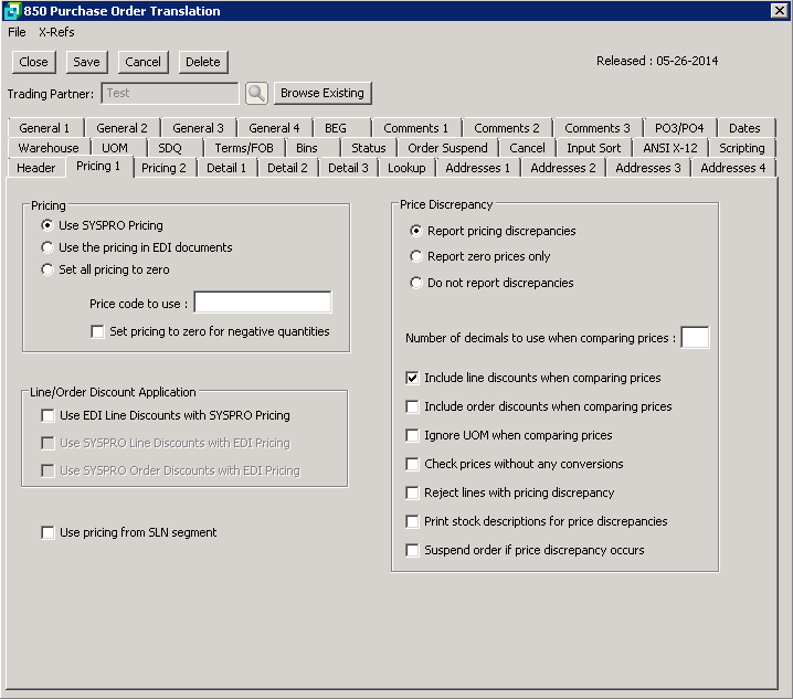 Price Discrepancy The system is able to compare prices submitted on the 850 to the prices within SYSPRO. The system also allows you the option of having discrepancies reported on the Import Report or you can have the system reject items with pricing having a price variance. Discounts can also be included in the Import Report or rejected as with variance in pricing. The number of decimal places in the pricing may be set for comparison purposes. The SYSPRO price will be rounded to this number of decimals to compare with EDI. Select from the following the options that best suit your requirements. |
