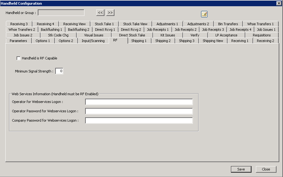 If the handheld device is reporting a signal strength below this value, the operator will be warned before posting the transaction that the handheld should be moved to a location with a stronger RF signal. Note: the operator can select Help-->System in the handheld menu to view a grid display of information that includes the current RF signal value. |