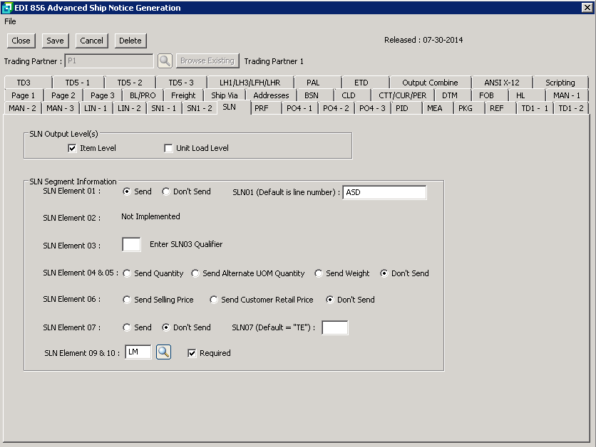 Select if SLN segment is to be sent at Item level in the 856 Document |