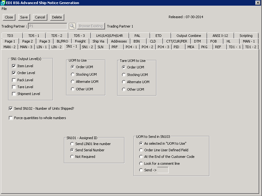 The SN1 - 1 and the SN1 - 2 screens are used to define the SN1 Segment such as which Elements will be sent and where the information is to be located in the 856 document. In addition you define line item details relative to the shipment for the elements being sent such as UOM number of units shipped, etc.