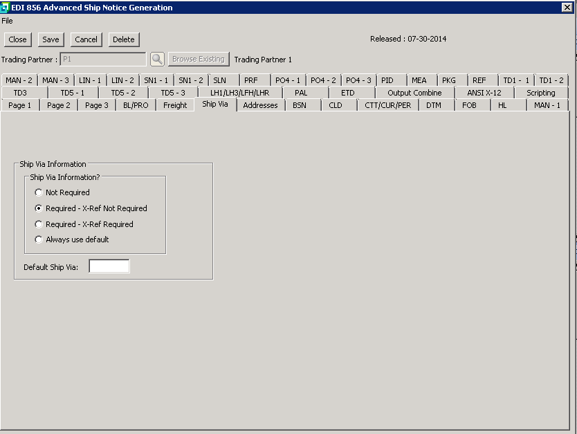 The Ship Via screen is used to define the requirements for sending the Ship Via Code and where the system is to locate the Ship Via information.