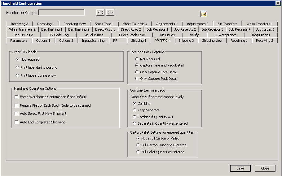 Tare and Pack Capture This option enables the tare or pack button on the handhelds. Note: the choice should match the tare and pack required options on the Shipping Station setup. |