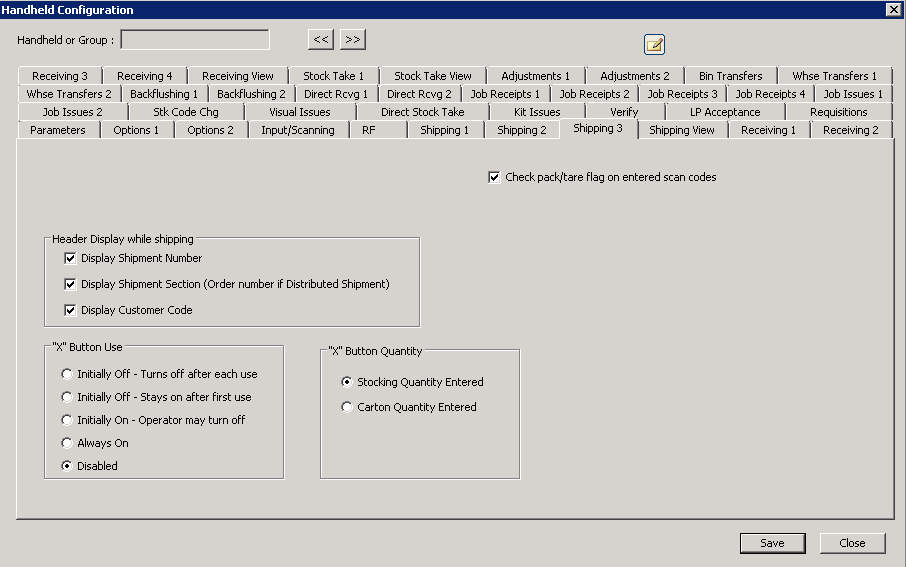 "X" Button Use The "X" button on the handheld can be used as a multiplier when no entry fields are displayed or no quantity entry fields are displayed. For example, if pallet full of boxes, the "X" multiplier allows the handheld operator to scan one box and enter a multiplier rather than scanning all boxes on the pallet. After the button is tapped, the following selection determines what happens next: |
