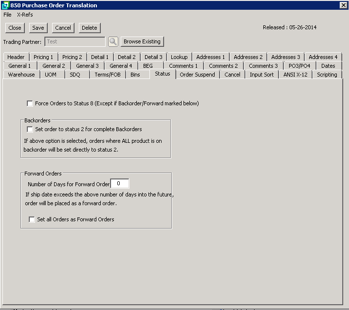 The Status screen is used to preset the Sales Order Status. If not set, the Sales Orders will be created with a Status of 1.