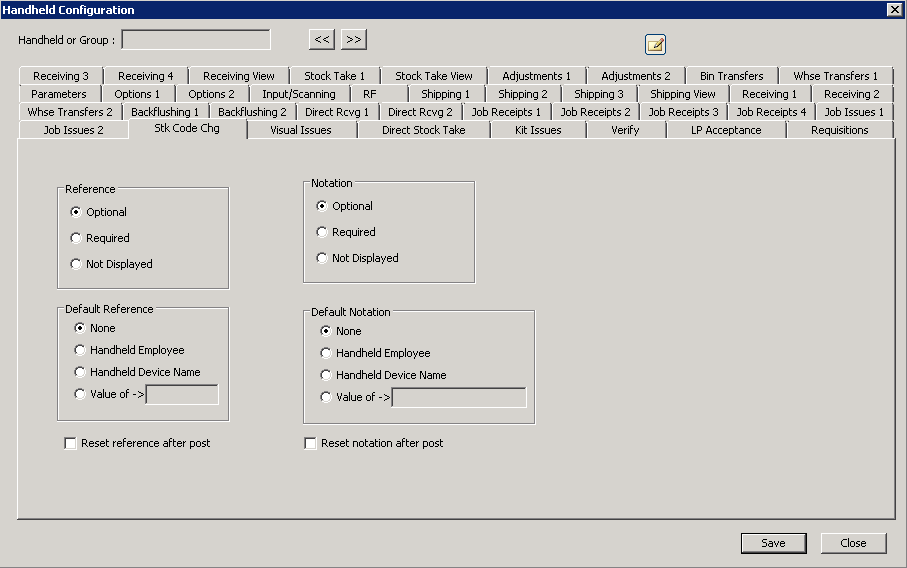 For each transaction type (adjustment, receiving, job issue, etc.), the following options tell the handheld whether it should ask for the reference or notation, and secondarily whether a default value should be used.