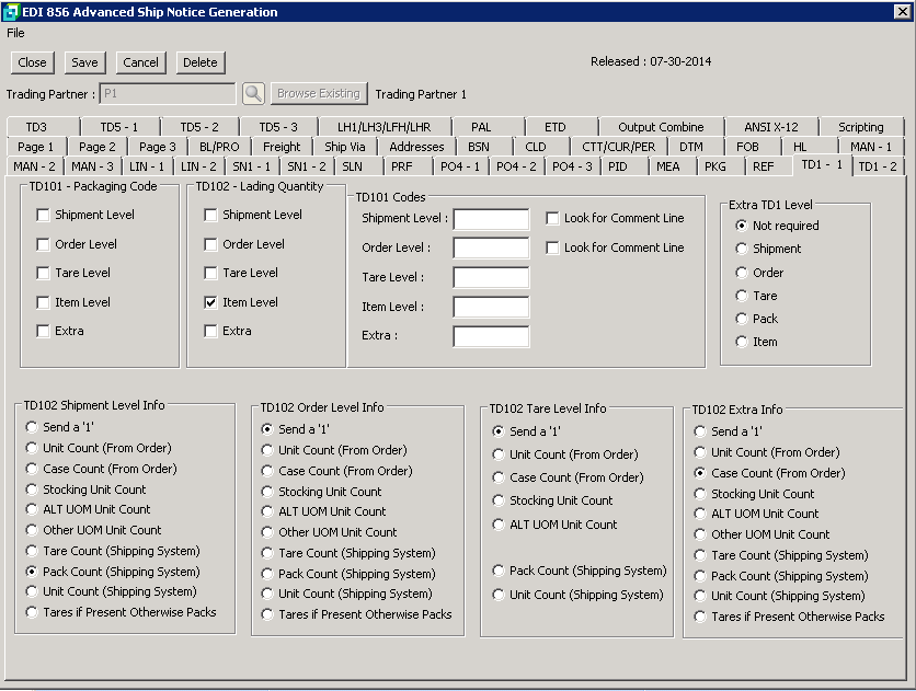 The TD1 (Transportation Details) Segment is used to define the output requirements for packaging codes and lading quantities and unit or basis of measure for the containers being shipped. The HL levels are also defined on this screen for the TD101 and TD102 elements. There is a TD1 - 2 tab to define additional transportation information.