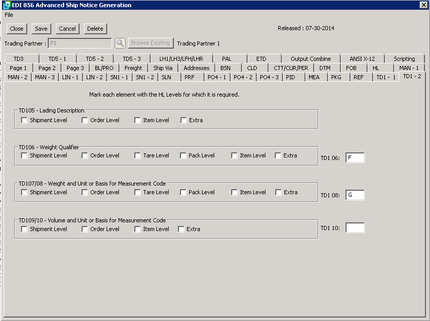 TD107/08 - Weight and Unit or Basis for Measurement Code Select the required HL Output Levels for Element TD105. All three levels or a combination of levels can be selected as required. |