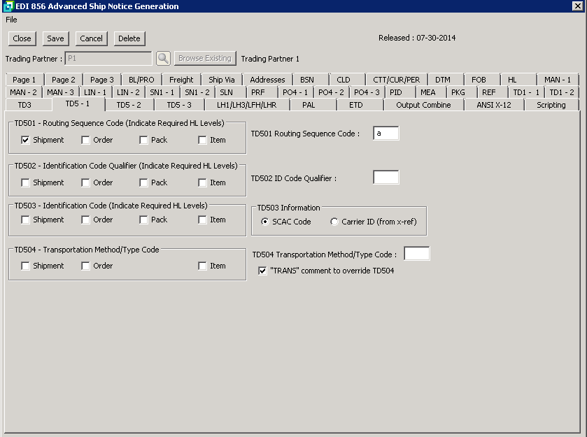 The TD5 screen is used to define HL levels for Transportation Details and define the data required to be sent in the TD5 elements.
