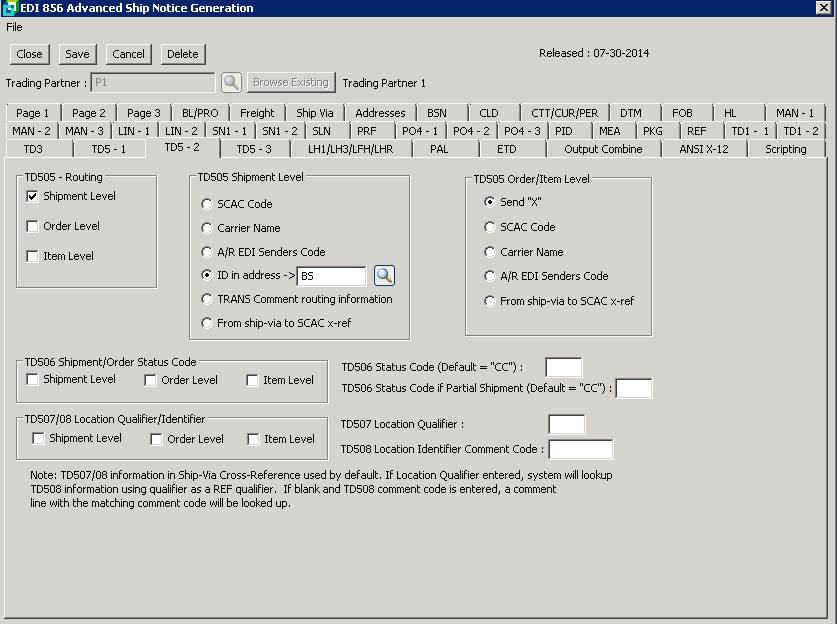 Note: TD507/08 information in Ship-Via Cross-Reference used by default. If Location Qualifier entered system will lookup TD508 information using qualifier as a REF qualifier. If blank and TD508 comment code is entered, a comment line with the matching comment code will be looked up. |
