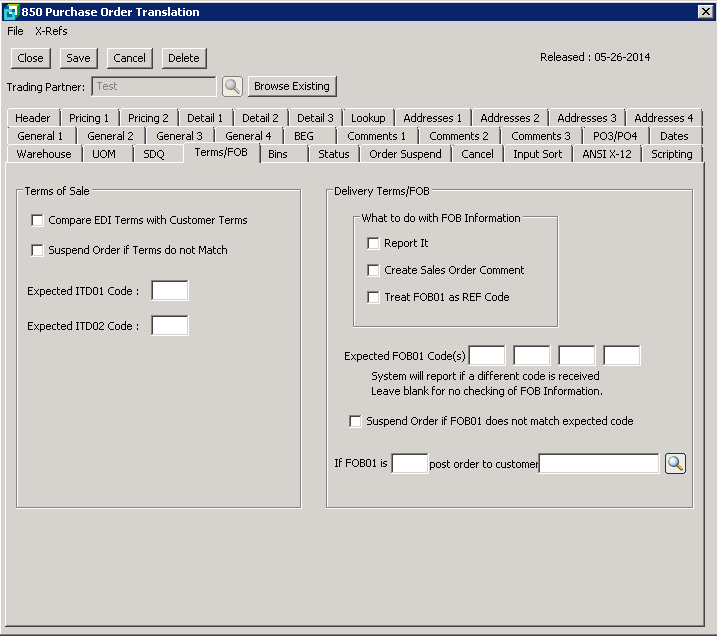 The Terms/FOB screen is used to specify the requirements for handling terms codes and FOB code information.