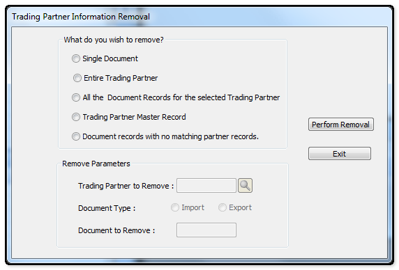 Select to remove a single Document (Import or Export) from the Trading Partner document records. Selecting this option will activate the Remove Parameter fields. Enter the trading Partner to remove, select the Document Type (Import or Export) and enter the number of document to be removed. |