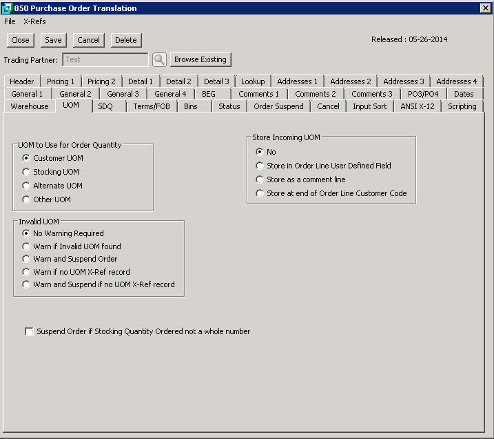 Store Incoming UOM If using one of the above options, and an order is created using a UOM different from the one sent in, using the "Store Incoming UOM" will allow you to store the UOM that was originally submitted. Select from the following the preferred method for storing the original UOM that was sent in the 850 document if required. |