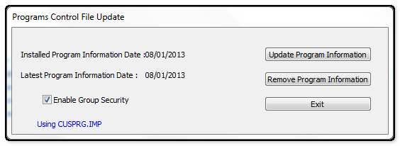 The date displayed here represents the date that new information was released for the Program Listing. A date in this field that is later than the Installed Program Information date indicates that the Update Program Information function (CUSPRG.IMP files) needs to be run.  |